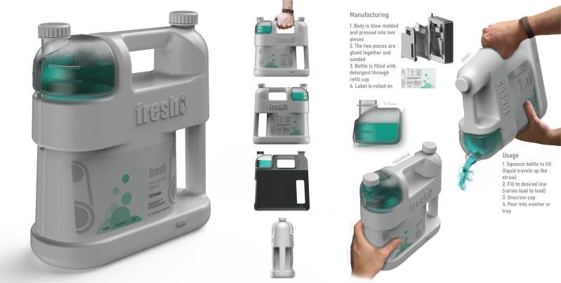Squeezable detergent that eliminates the hassle of making life cleaner. Inspired by the bettix bottle used in the the automotive and maintance industry, the squeezable design allows users to accurately measure liquids and pour quickly while avoiding the mess.